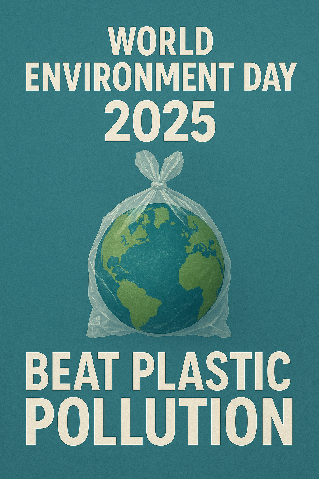 A digital poster for World Environment Day 2025 features a bold blue-green background. Centered in the design is a depiction of Earth enclosed in a transparent plastic bag, tied at the top, symbolizing the suffocating impact of plastic pollution. Above the image, large white text reads “World Environment Day 2025,” and below, in equally bold font, the slogan “Beat Plastic Pollution” is displayed, reinforcing the global call to action.